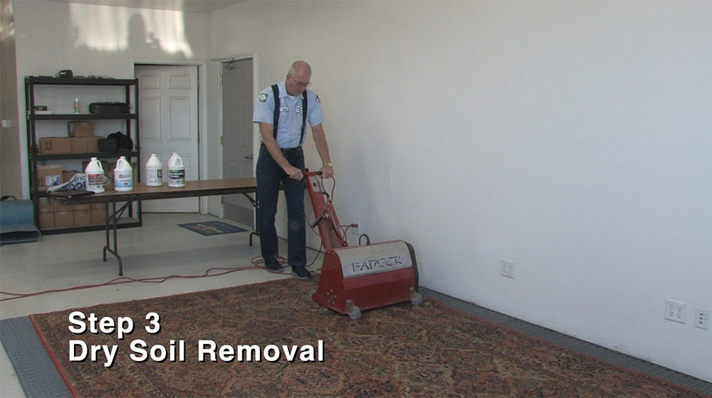 Dry soil removal is achieved using our special Rug Badger dry soil removal system.