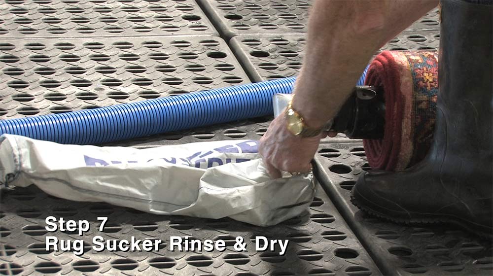 After your rug is flat rinsed, it is then rolled up on our special rug sucker tube system.